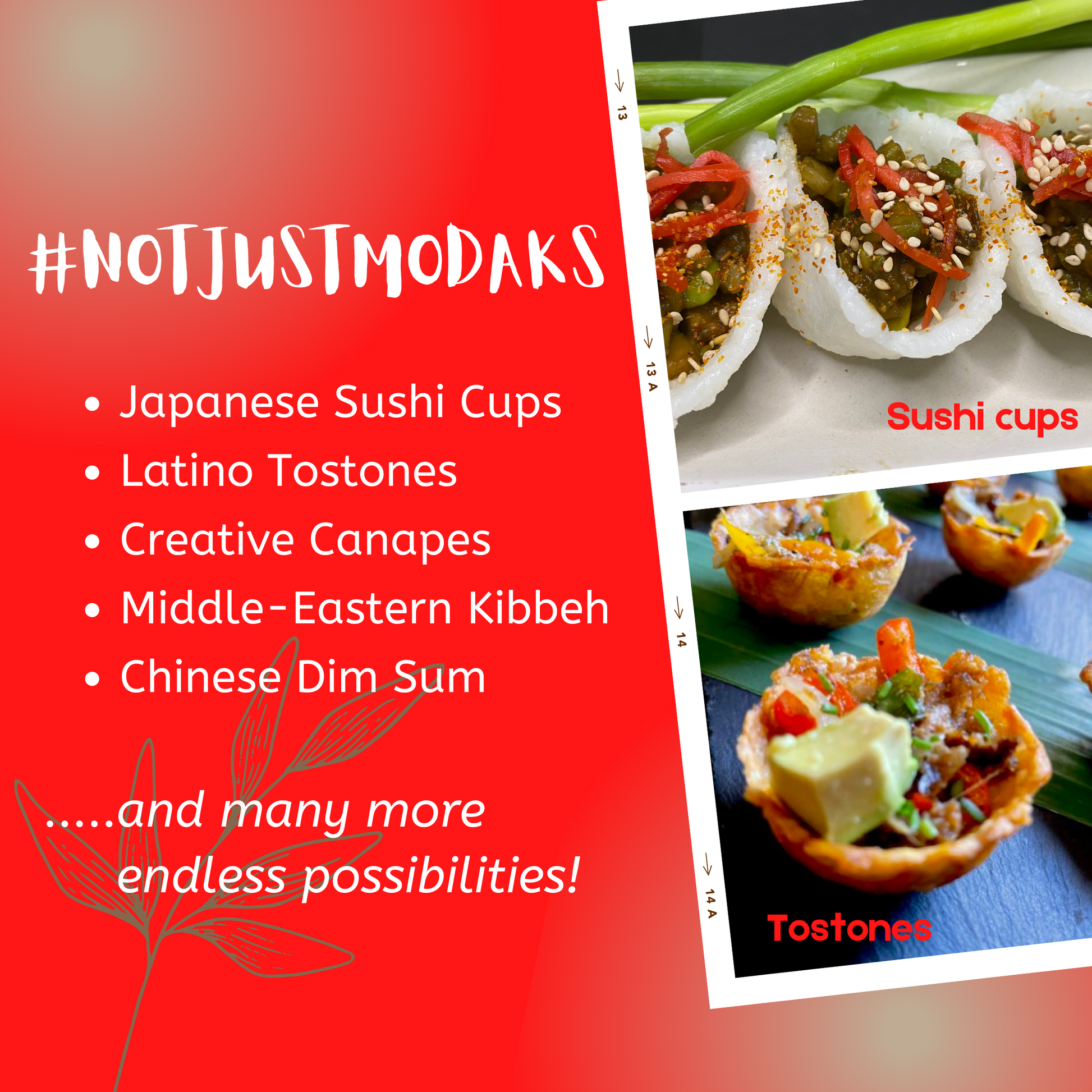 Easy Modak is not just for Modaks though - Japanese Sushi Cups, Latino Tostones, Canapes, Middle-eastern Kibbeh, Dim Sum - the world is yours to explore and we’ll help you with our recipes and suggestions!